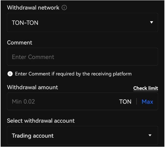 TON 코인을 선택한 후, ' On-chain'을 선택합니다. 그러면 자동으로 네트워크가 TON-TON 네트워크로 설정됩니다.