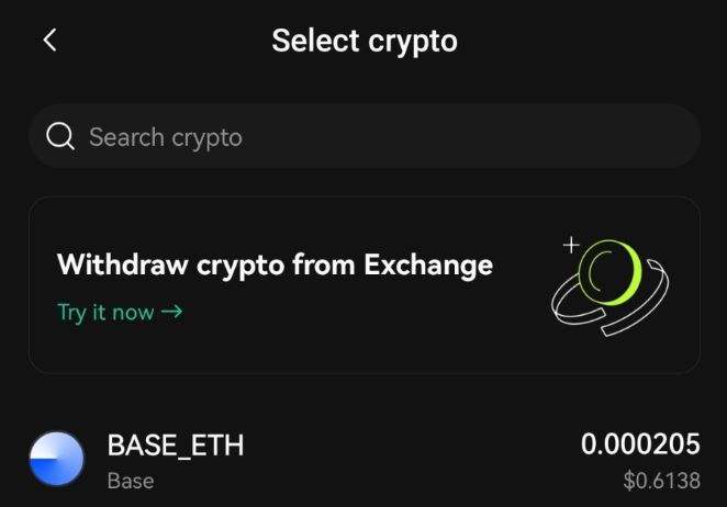 OKX 지갑으로 이동한 후, 상단에 있는 'Wallet' 버튼을 클릭합니다. 여기서 'Receive' 버튼을 클릭하면 'Withdraw crypto from Exchange'라는 배너를 볼 수 있습니다.